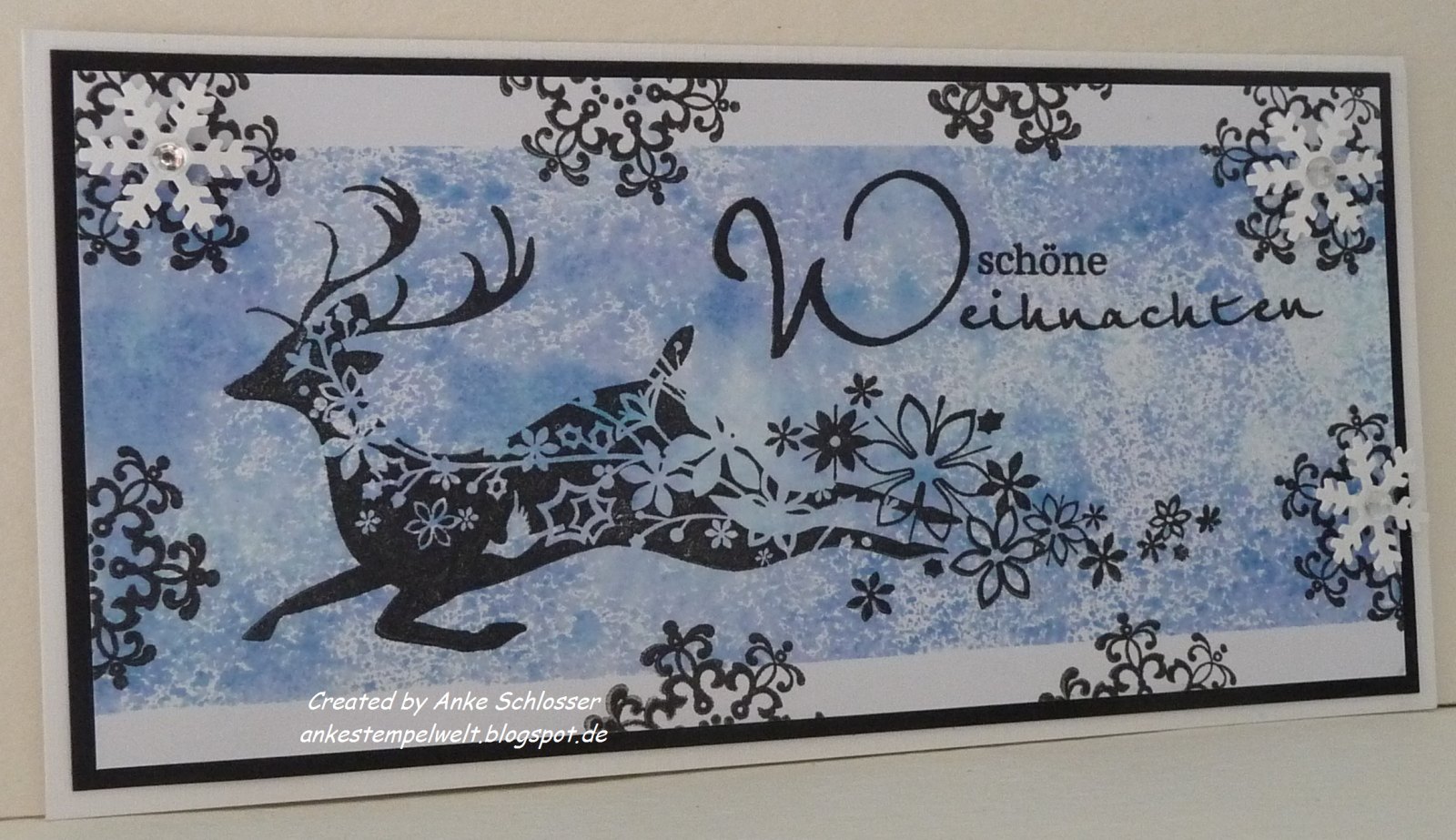 Mit der schönen Winterlandschaft von Cherry Pie sind diese Weihnachtskarten entstanden. Der Schriftzug ist von Memory Box und die Hirschfamilie aus dem Set "Wintersong" von s.e.i. Verziert habe ich die Karten mit kleinen Sternen, deren Mitte noch kleine Halbperlen zieren.