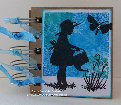 Für diese gepimpte Notizbüchlein, das mit bunten Post-Its gefüllt ist, habe ich das goldige Gartenmädchen aus dem Set "Sweet days of summer" von Flourishes verwendet. Der blaue Hintergrund ist mit einem kleinen quadratischen Acrylblock, blauer Stempelkissenfarbe und Wasser enstanden. Der kleine Schhmetterling aus dem Set "Garden delight" von Inkadinkado ist noch mit zwei kleinen Rhinestones und die Spiralbindung noch mit blauen Bändern verziert.
